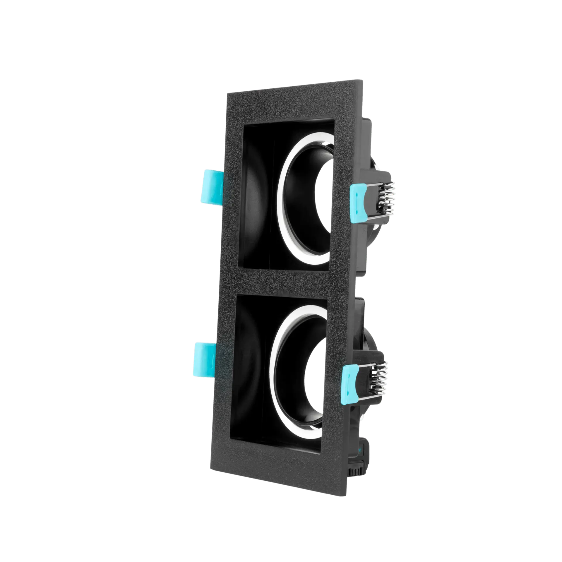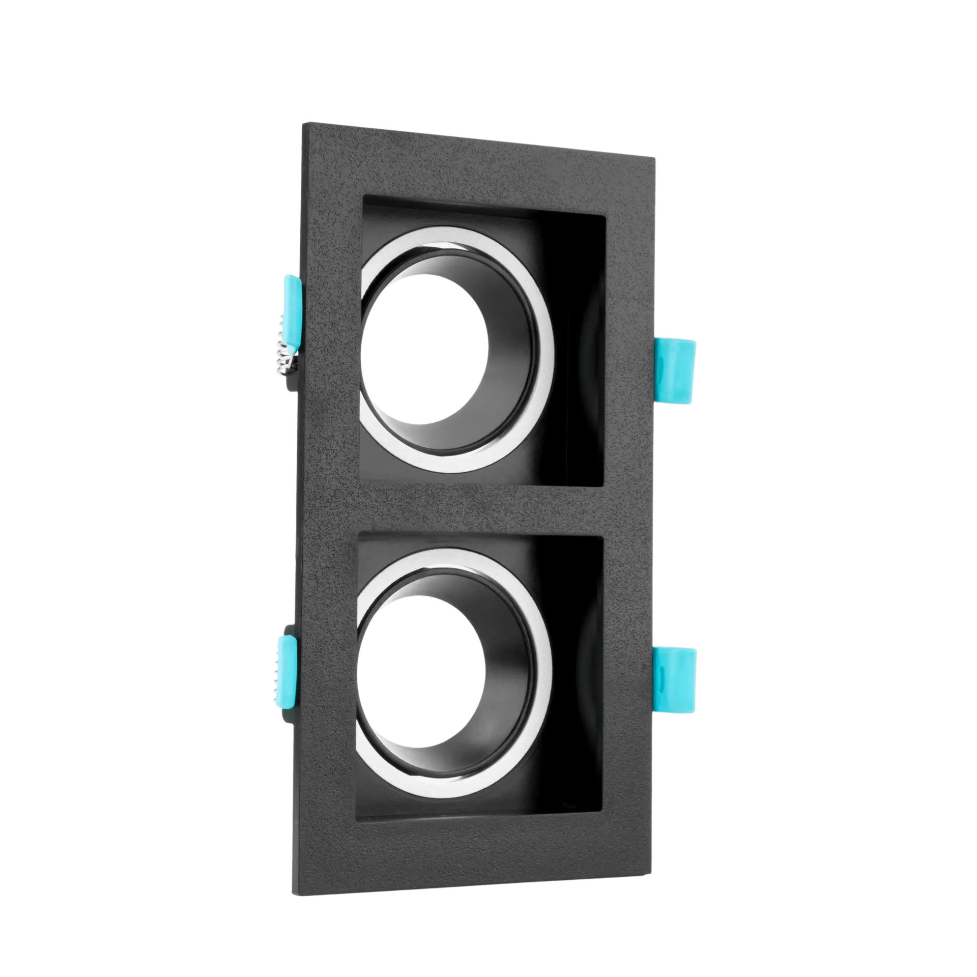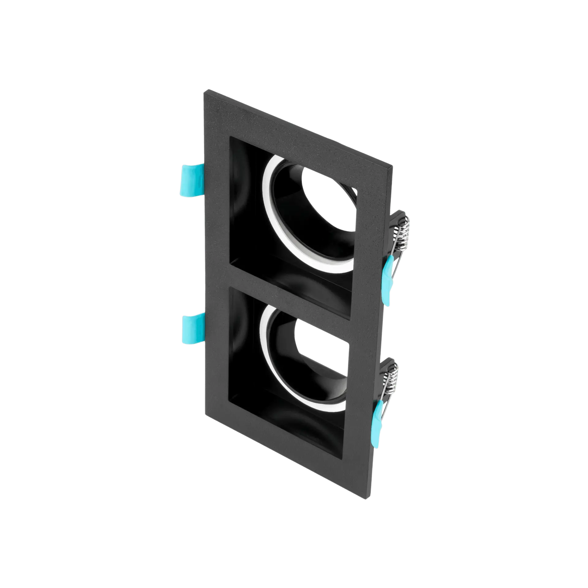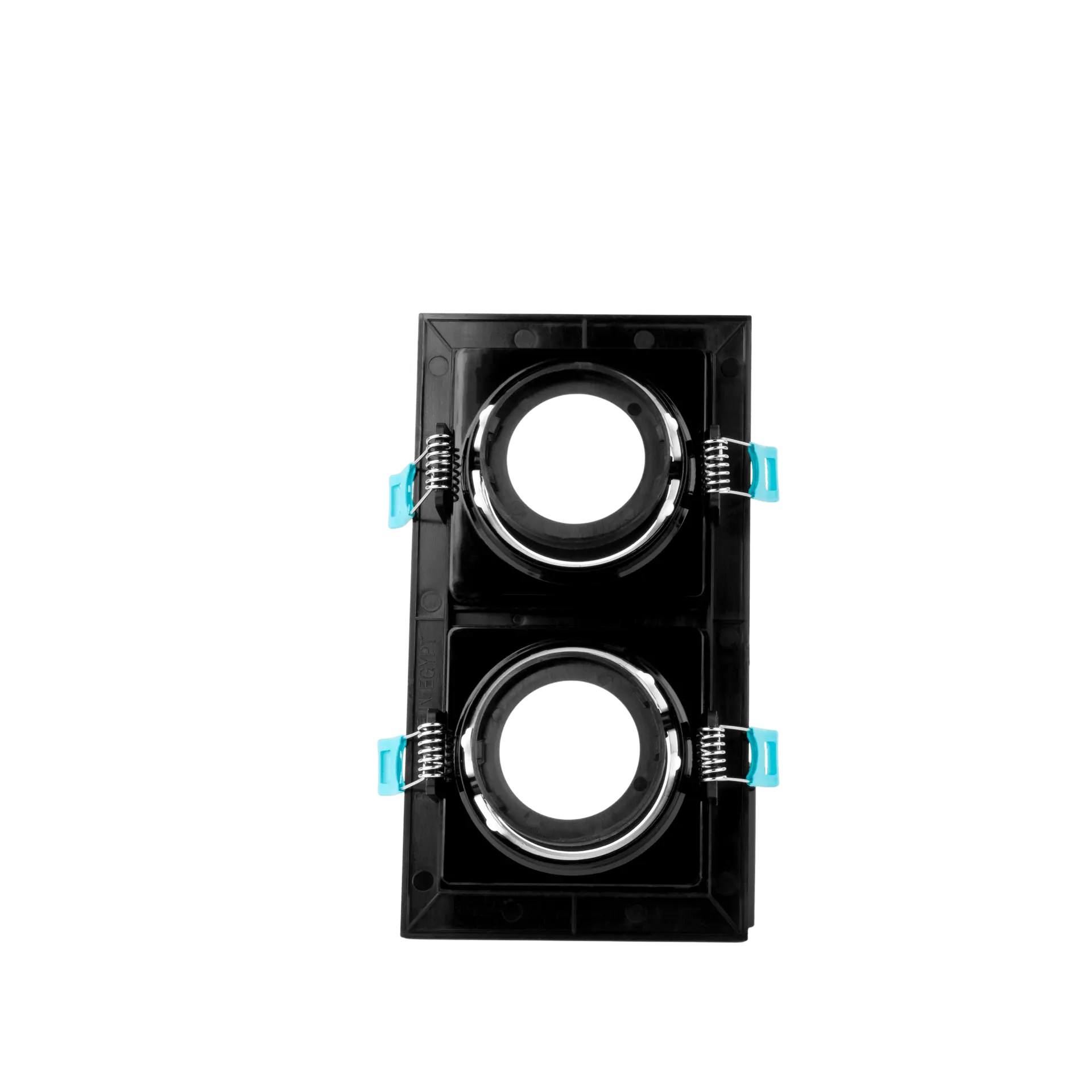 Square double spotlight made of high-quality PC material, with dimensions of 100 × 100 mm. It consists of an outer face, frame, adjustable reflector for directing the light, and a back cover. The available piece comes with a black face, black frame, white reflector, and black back cover. It features a modern elegant design and practical performance, making it suitable for indoor use to provide ideal lighting in homes or shops.