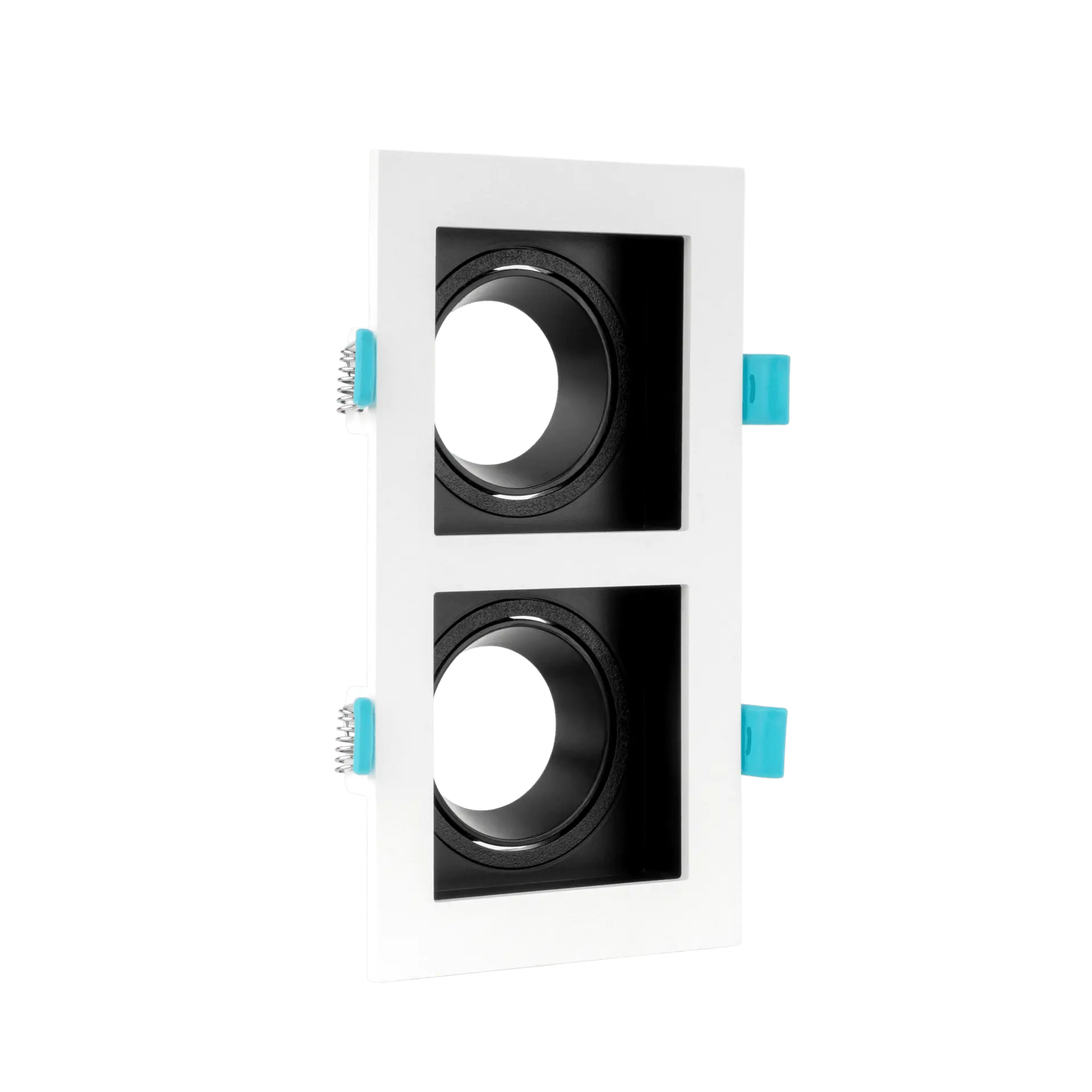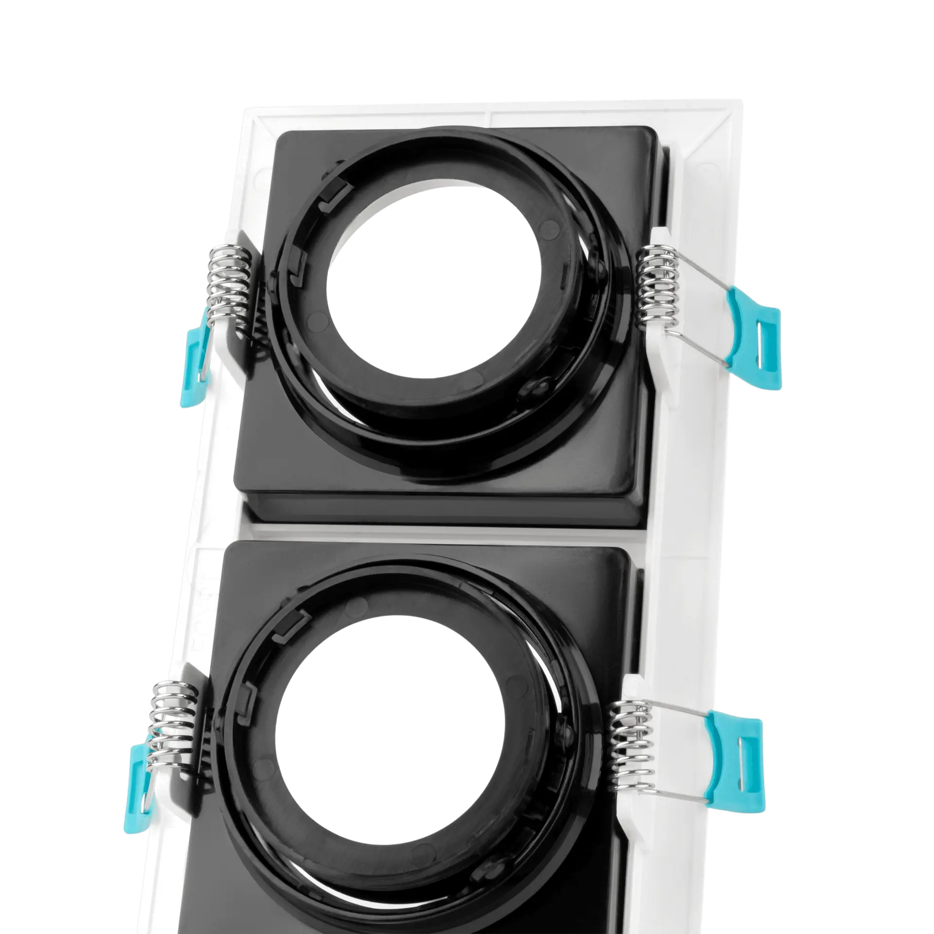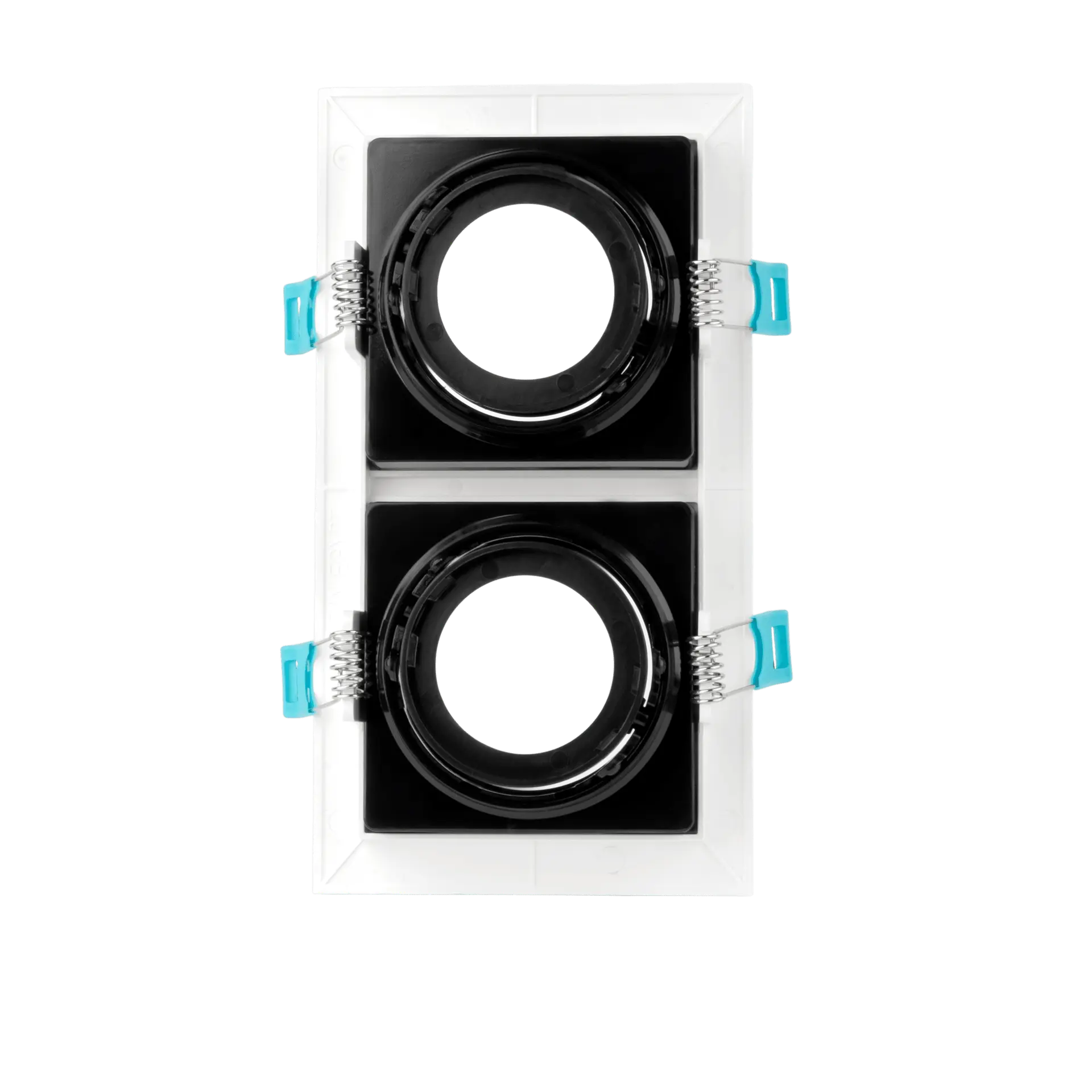 Square double spotlight made of high-quality PC material, with dimensions of 100 × 100 mm. It consists of an outer face, frame, adjustable reflector for directing the light, and an inner ring. The available piece comes with a white face, black frame, black reflector, and black ring. It features a modern elegant design and practical performance, making it suitable for indoor use to provide ideal lighting in homes or shops.