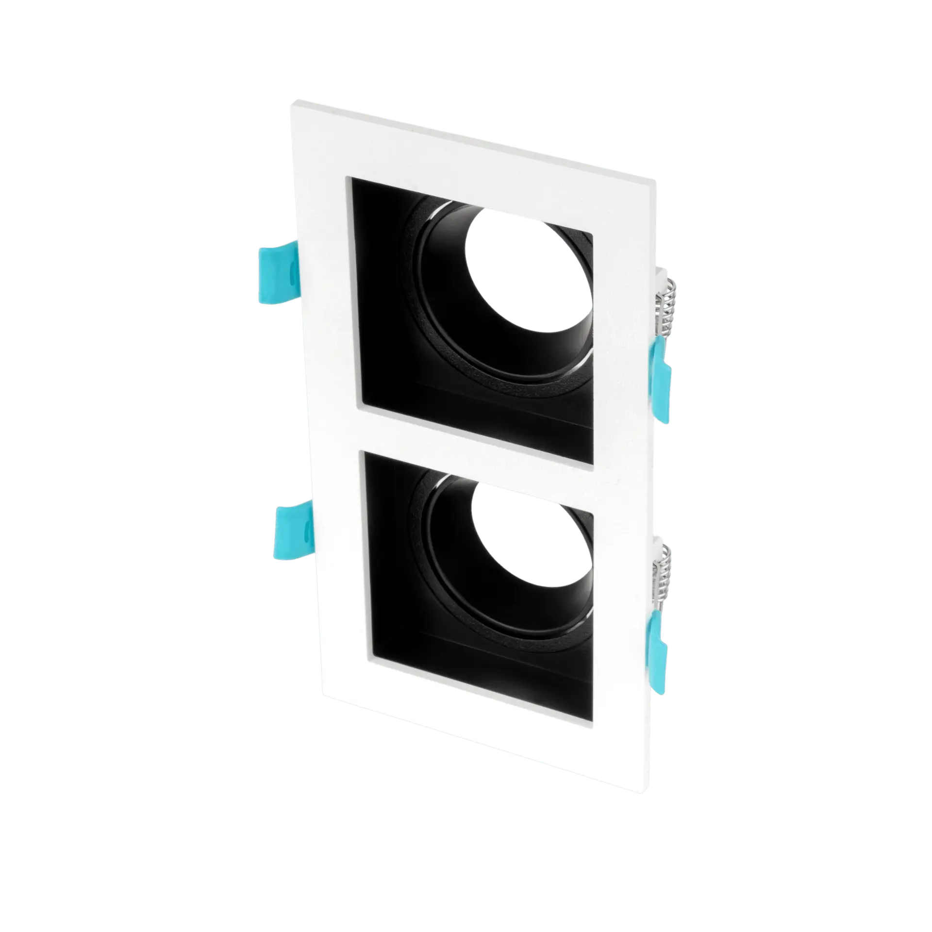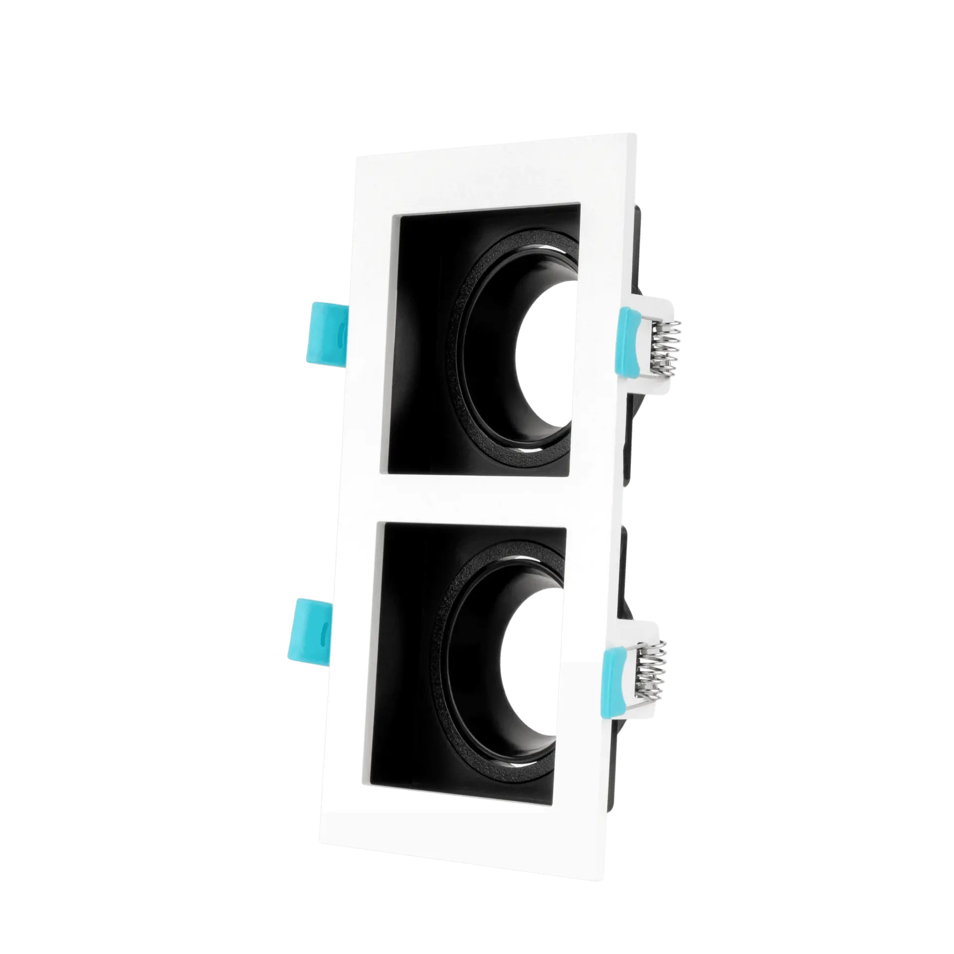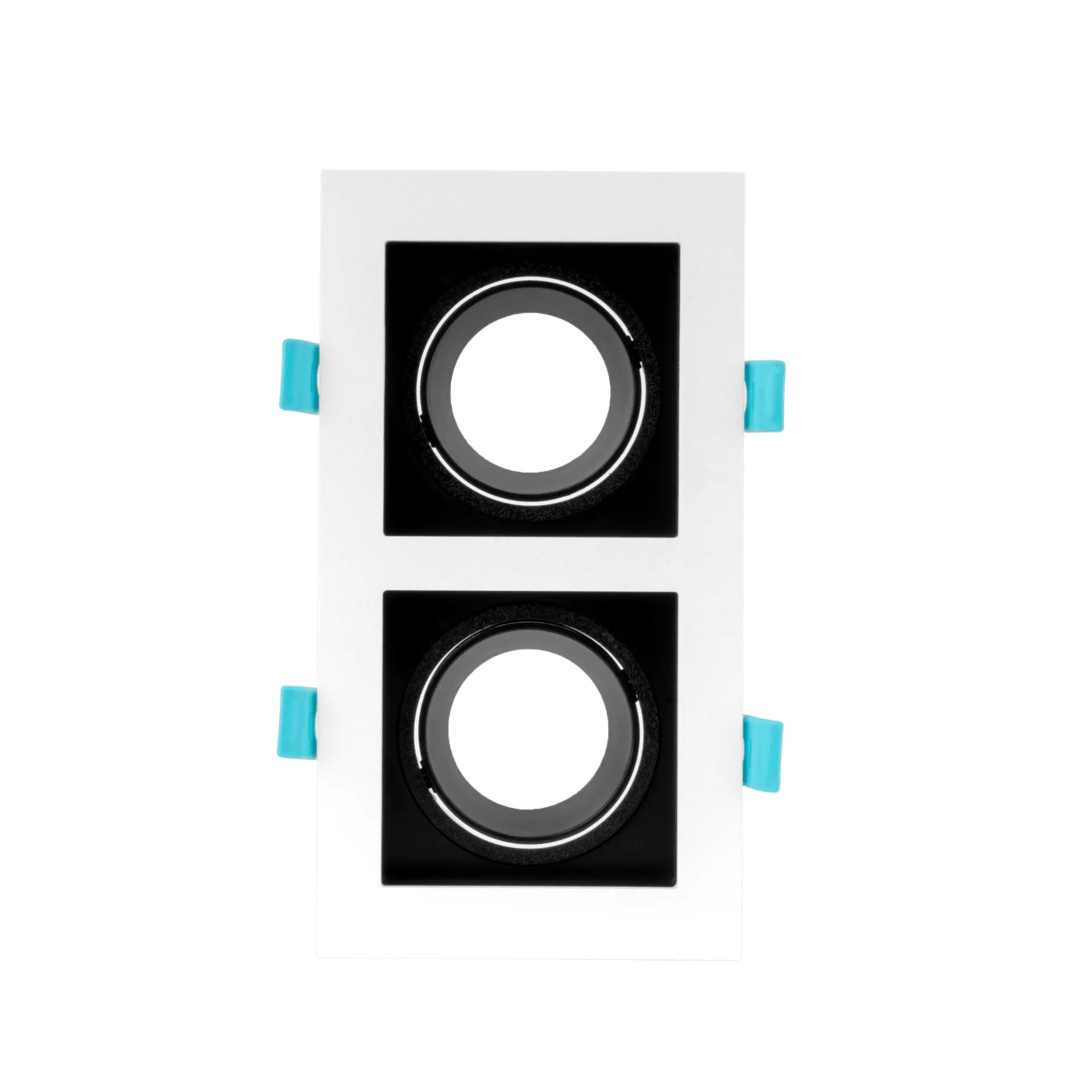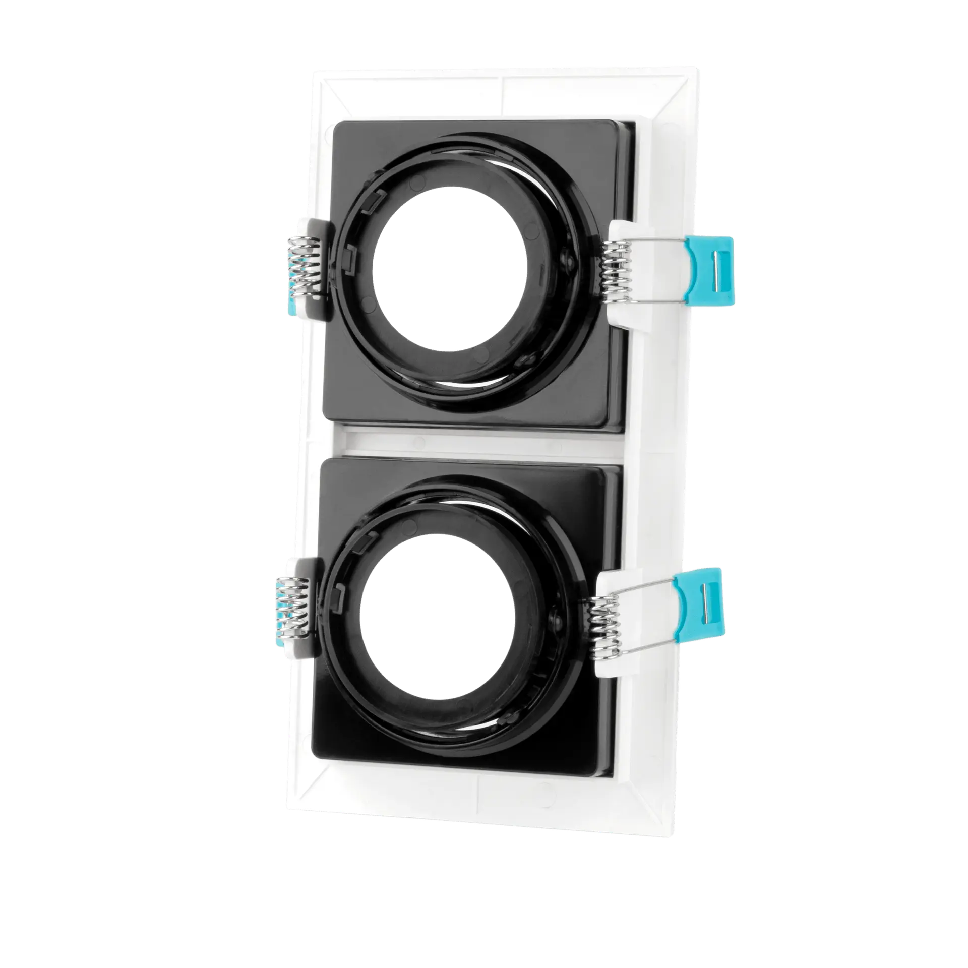 Square double spotlight made of high-quality PC material, with dimensions of 100 × 100 mm. It consists of an outer face, frame, adjustable reflector for directing the light, and an inner ring. The available piece comes with a white face, black frame, black reflector, and black ring. It features a modern elegant design and practical performance, making it suitable for indoor use to provide ideal lighting in homes or shops.