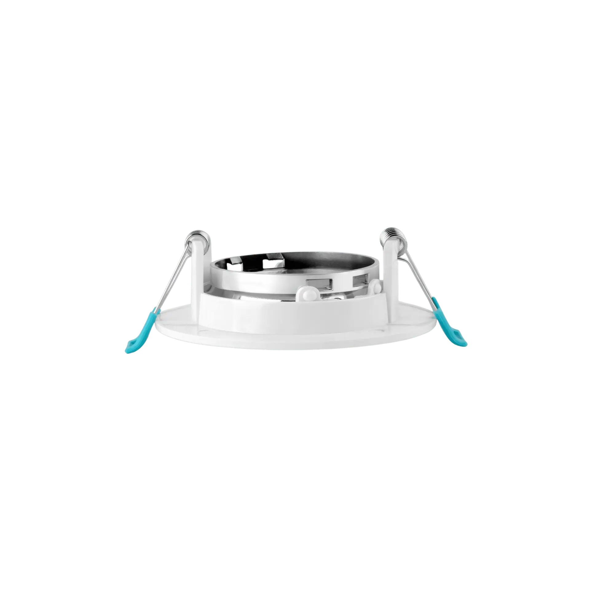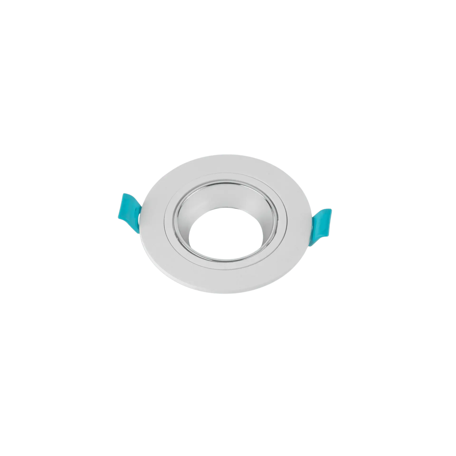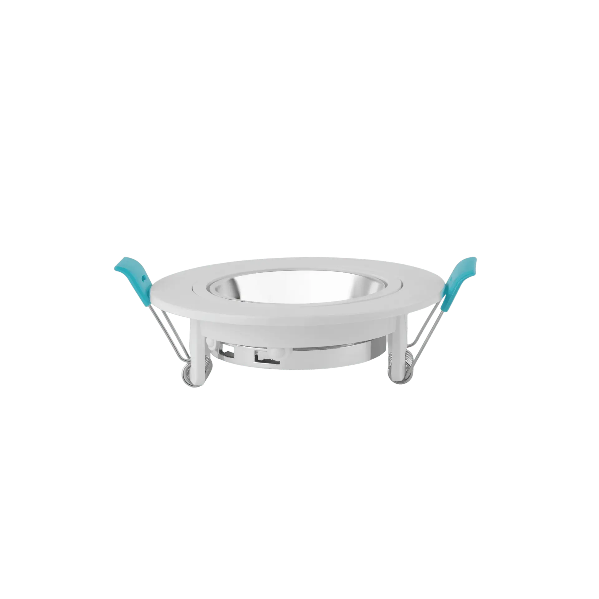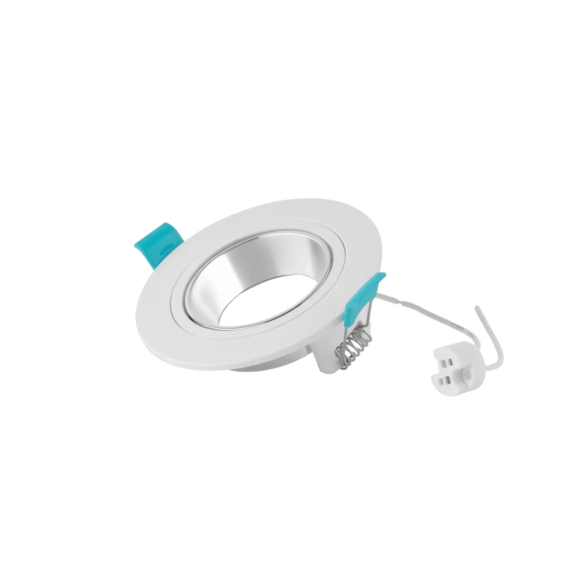 Spotlight featuring a white trim, white reflector, and a gold ring. It is crafted from high-quality PC (Polycarbonate) material with a 90mm outer diameter and a 70mm inner diameter. The fixture consists of an outer trim, an inner ring, and an adjustable reflector for directing light. It is available in multiple color options—including white, black, silver, and gold—for the trim, reflector, and ring components respectively. Suitable for indoor use, offering a modern design and practical performance.