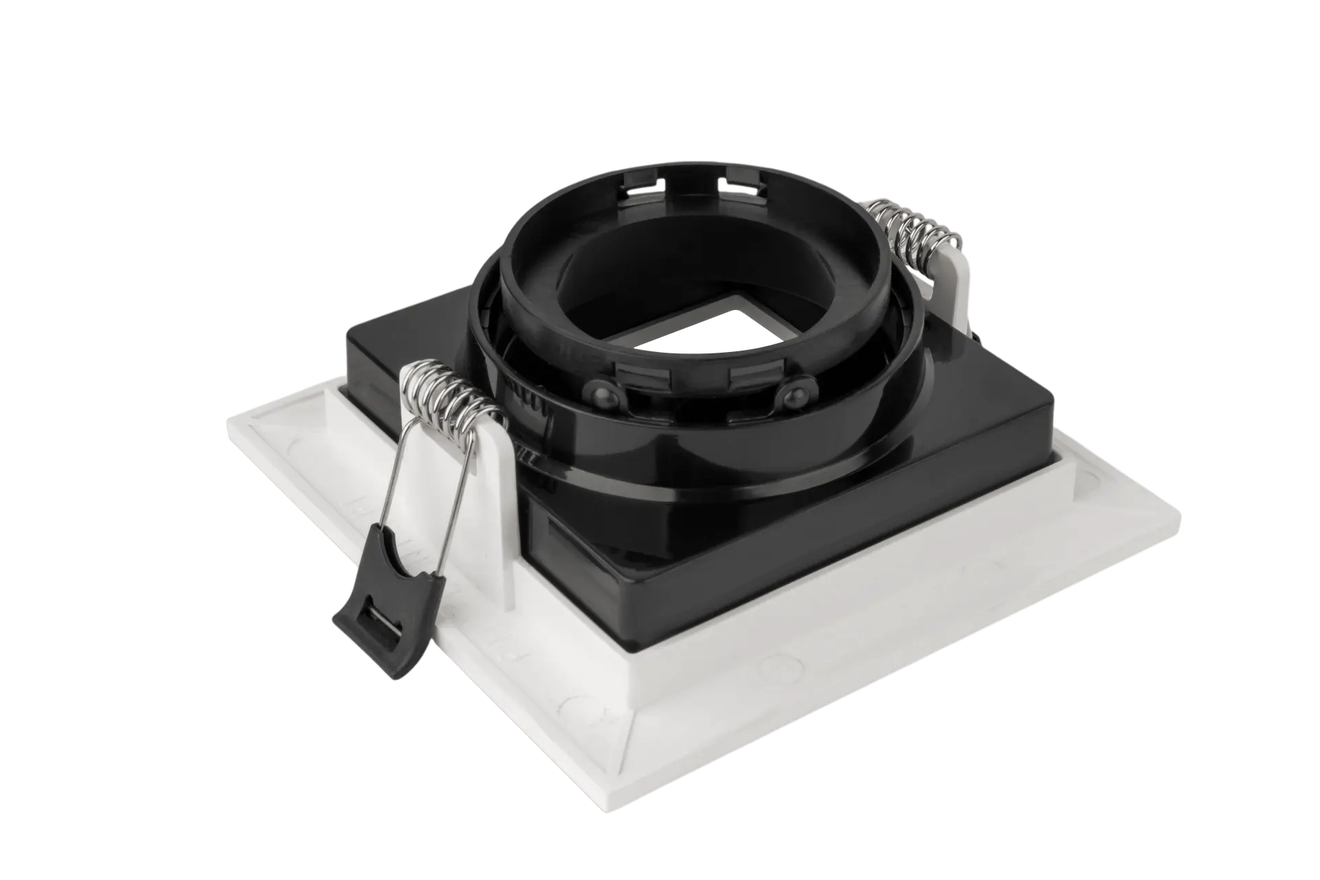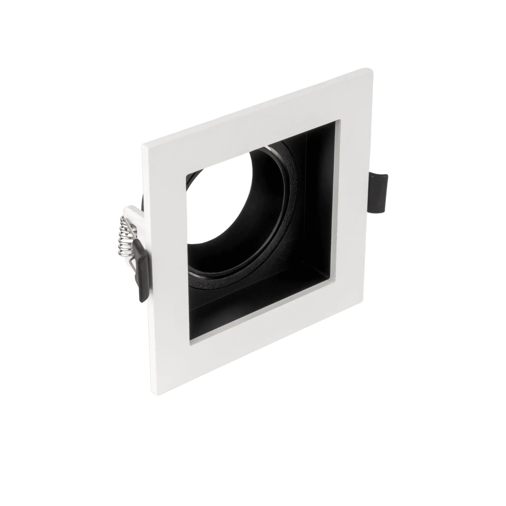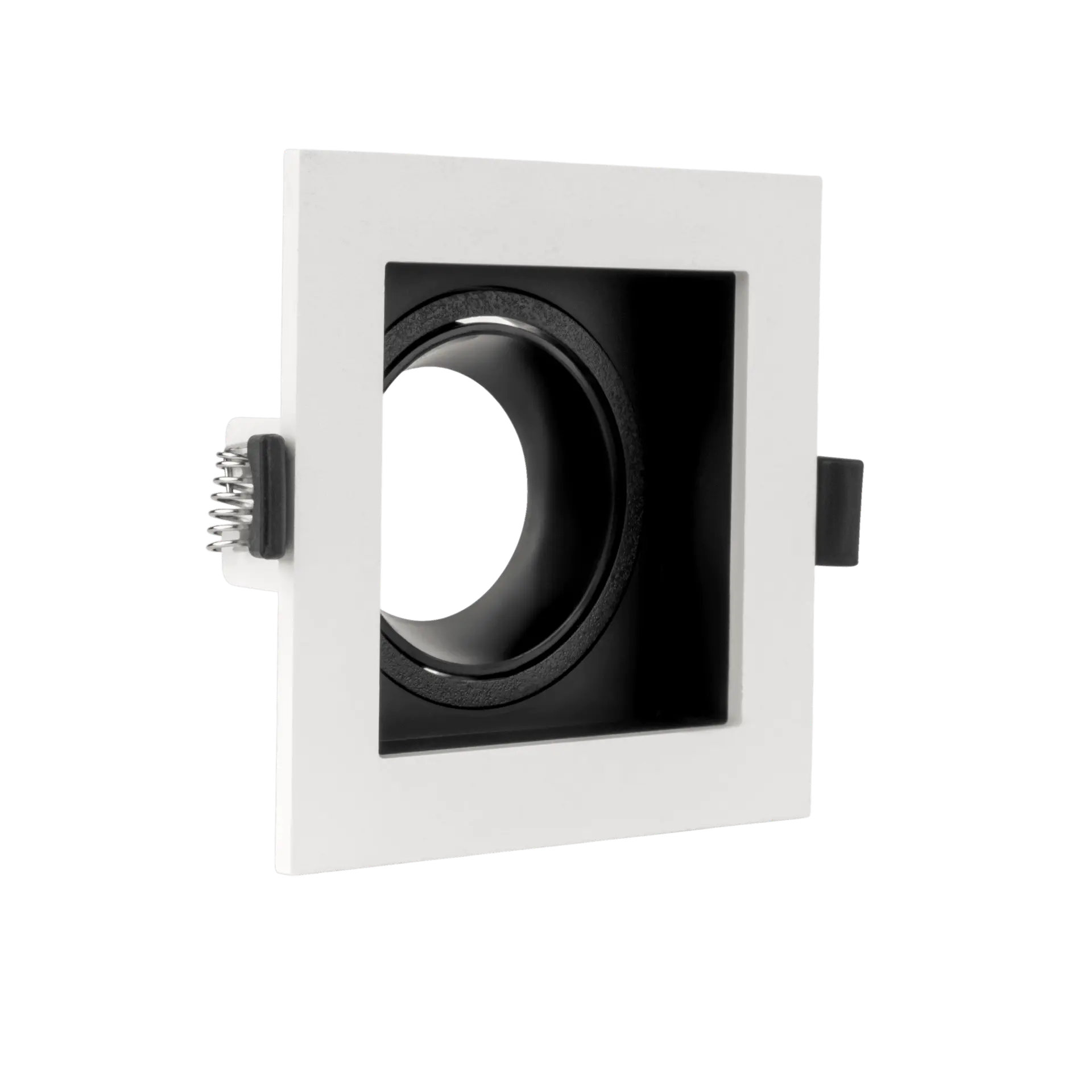 Single square spotlight chassis made of high-quality PC material, precisely designed to include an outer face, frame, adjustable reflector for directing light, and inner ring. It features durability and a modern appearance. The available piece comes with a white face, black frame, black ring, and black reflector. Suitable for indoor use, offering an elegant look with practical performance for perfect lighting in homes or shops.